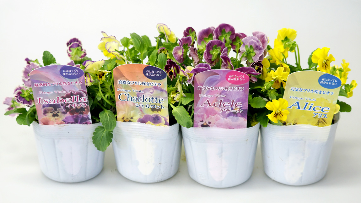 花径3~4cm程度のフリンジタイプのビオラ。分枝性に優れて株のボリュームができ、非常に多花性で春まで咲き続ける。プラグ苗から5~6週が3.5号ポット出荷の目安。※実生繁殖なので、花色や花型には多少のバラつきが生じます。