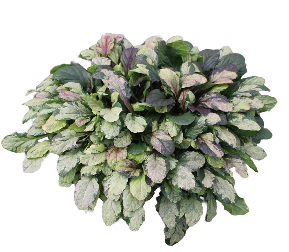 弊社育種のオリジナル品種。クリーム・グリーン・バーガンティ等の斑が複雑に入りとてもユニークな色合い。低温期には全体的黒味が増し独特な色合いになります。春にはパープルブルーの花を開花。一般的なアジュガに比べて差別化ができ、ワンランク上の価格が期待できます。3.5号ポット出荷向き。