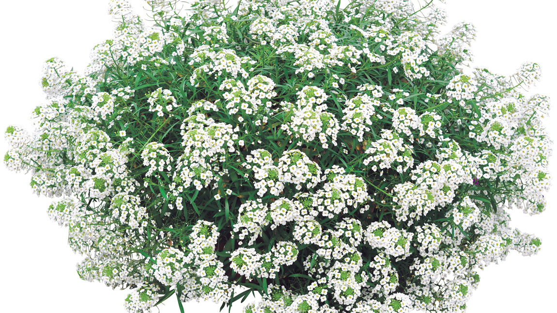 一般的な実生のアリッサムに比べ、圧倒的な生育能力があり、秋から冬のみならず春から初夏にかけても楽しめる驚異のスーパーアリッサム。暑さや寒さに強くて、生育旺盛で大きなマウンド状に成長しながら咲き続ける。3.5号ポット仕立ての場合、プラグ苗から2回ピンチで10~12週が出荷の目安。