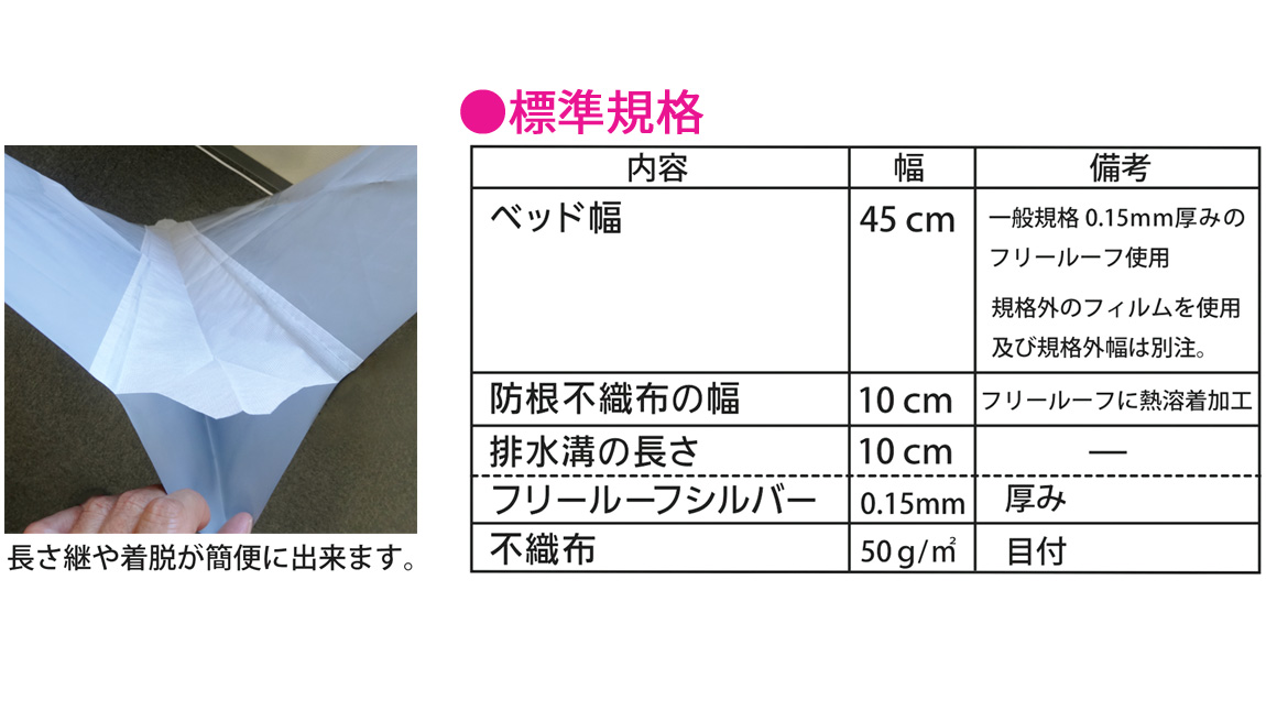 イチゴ実採り栽培には高設ベンチが欠かせませんが、一般的には初期費用がかさみ、他の作物からの転作は簡単ではありません。実楽るベッドは0.15mm厚遮光農POフィルムに、排水溝用に巾10cmの防根不織布を接着し、簡単にイチゴの高設ベンチ用途として設置できるシートです。ビニールハウスに使用する19.1mm直管パイプを加工してベット巾45cmの基礎ベンチを作り、それにパッカーでシートを固定します。シートは必要な長さにカットして納入されます。耐久性に優れたPOフィルムを使用しているので、軽くて設置が容易で、しかも長期に渡り使用できます。